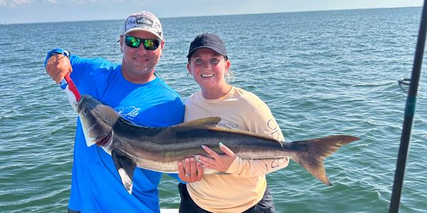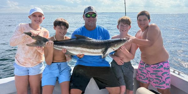 Every year we enter in numerous local tournaments. In 2019 Tripp and long time friend Ryan Wood entered the East Coast Cobia Championship and won with a 74.05 Cobia. It was a tough day of fishing and they only got one bite throughout the day. The fish did not give up easily, wrapping himself in all the other lines that were out, took the crew around the boat four times, and broke the rod tip off when he wrapped up in the chum bucket. Luckily the hook never came out and we were able to land it!